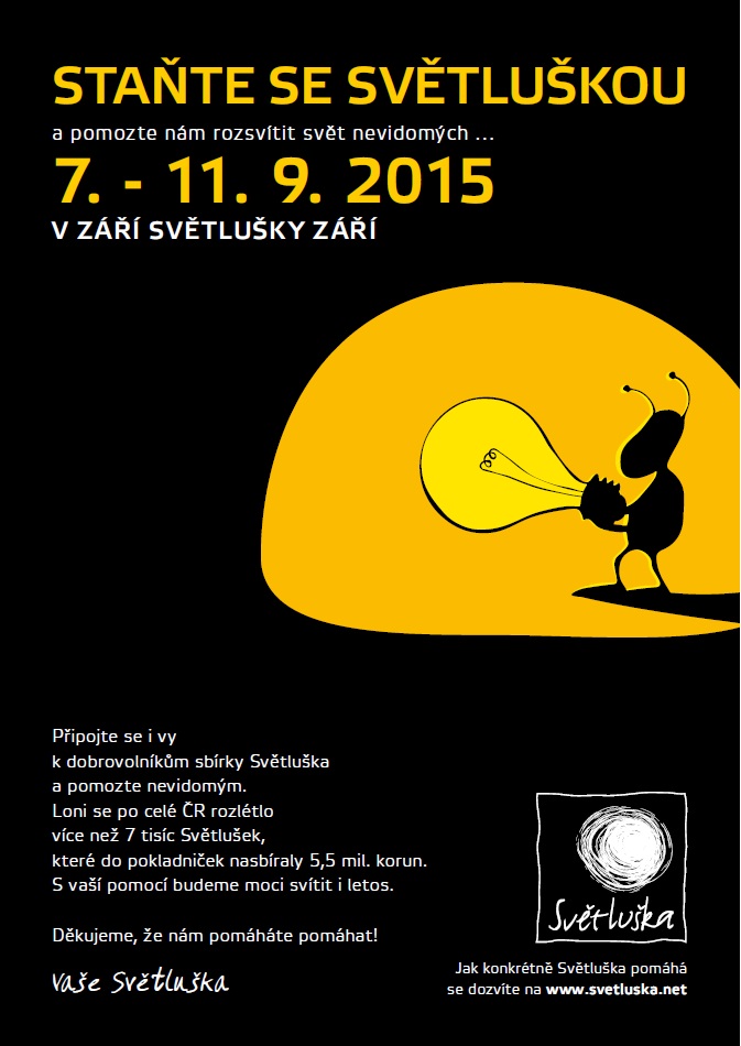všem Světlušku vřele doporučuji, vše je zařízeno, pokladničky, trika, tykadla a náramky vám přijdou poštou do klubovny, stačí již jen vaše odhodlání pomoci skrze Nadační fond Českého rozhlasu lidem se zrakovým postižením. Děti a mládež z obou českolipských oddílů chodily nadšeně po hlavní třídě a náměstí, oslovovaly lidi a téměř se nesetkaly s negativní odezvou. Jejich zářivé úsměvy při sečtení nasbírané hromádky peněz a hrdost z povedené sbírky byly téměř hmatatelné.